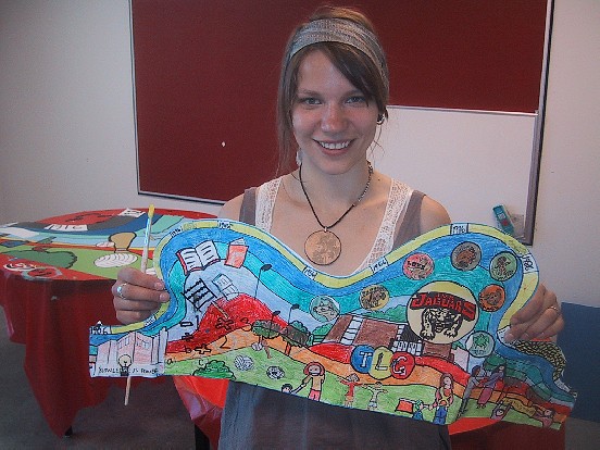 Art Teacher Alison Froese proudly shows the work of her students on one of the Mural panels.
